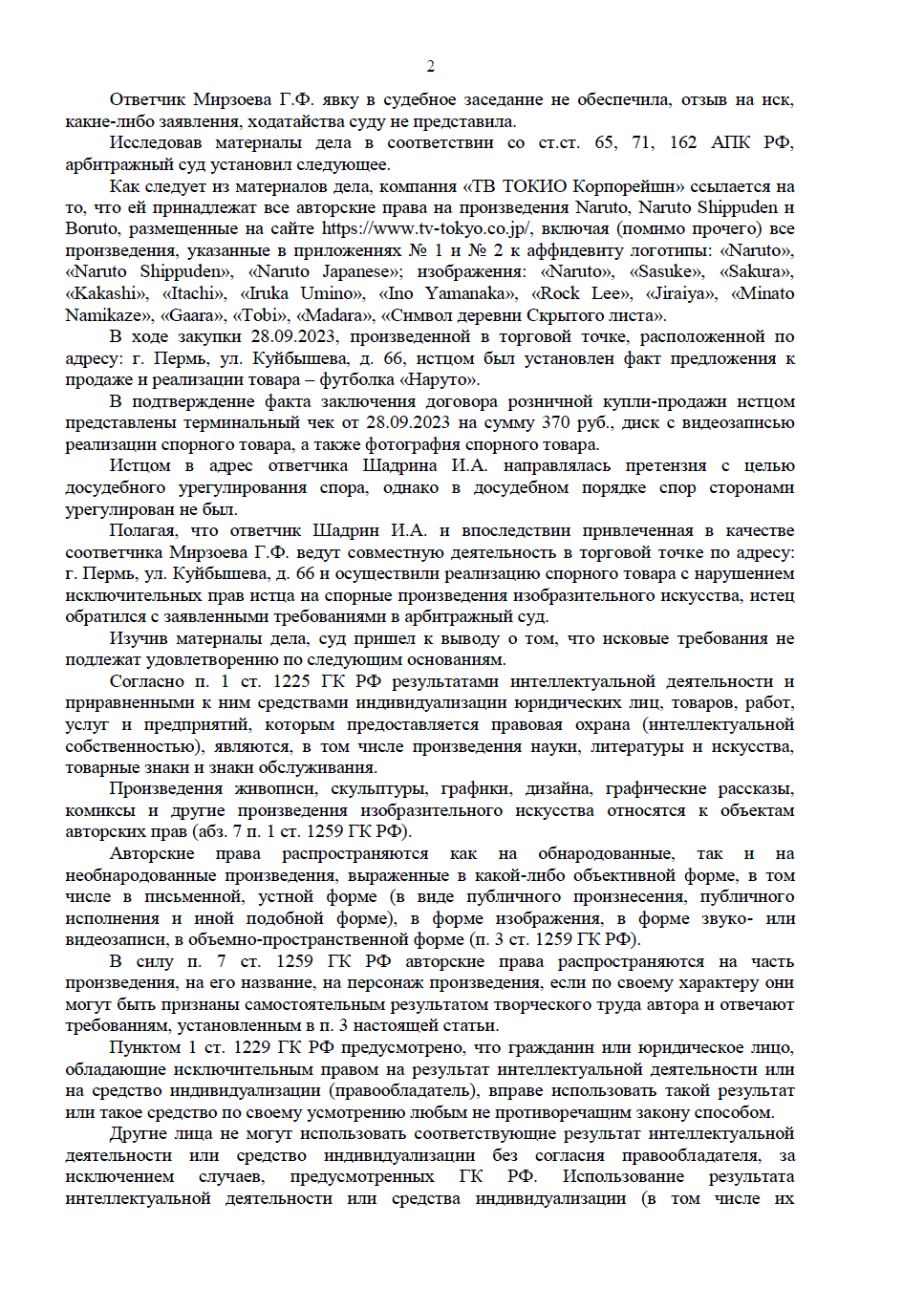 Иск был подан компанией «TV Tokyo Corporation» к двум индивидуальным предпринимателям, включая нашего клиента. Истец требовал взыскания компенсации за нарушение авторских прав, ссылаясь на своё эксклюзивное владение образами из аниме «Naruto». Ни истец, ни ответчики лично в заседаниях не участвовали, поэтому исход дела полностью зависел от качества представленных письменных доказательств и правовой аргументации.