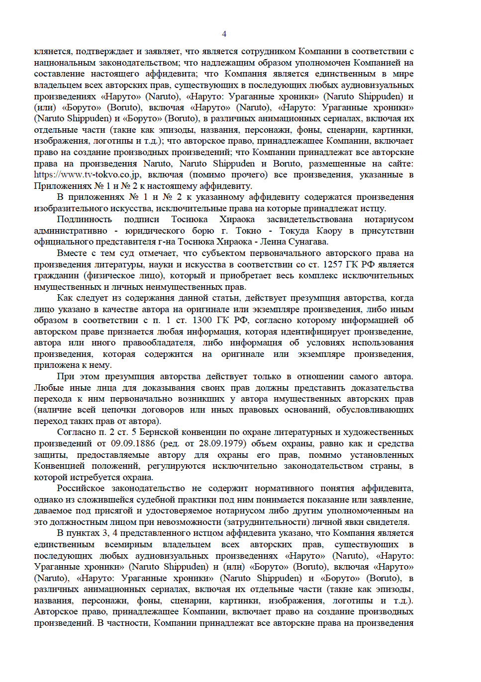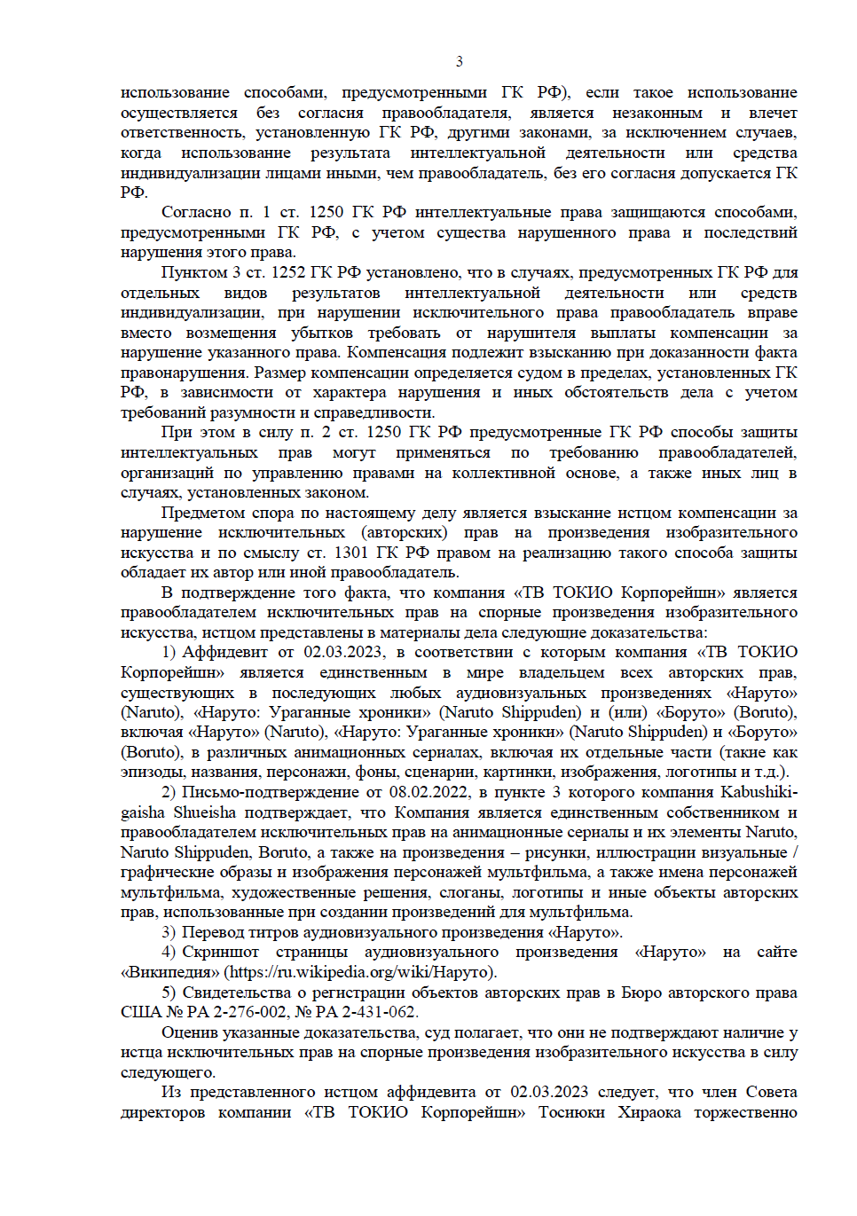 - Недостаточность доказательств права собственности. Истец предоставил аффидевит (заявление под присягой), письмо от партнёрской компании, скриншоты из «Википедии» и американские свидетельства о регистрации. Суд, вслед за нашей позицией и ссылаясь на практику Верховного Суда РФ, установил, что ни один из этих документов не подтверждает цепочку перехода прав от конкретного автора (художника) к японской корпорации. В них не указаны имена авторов, нет трудовых договоров или лицензионных соглашений – ключевых для российского суда документов.