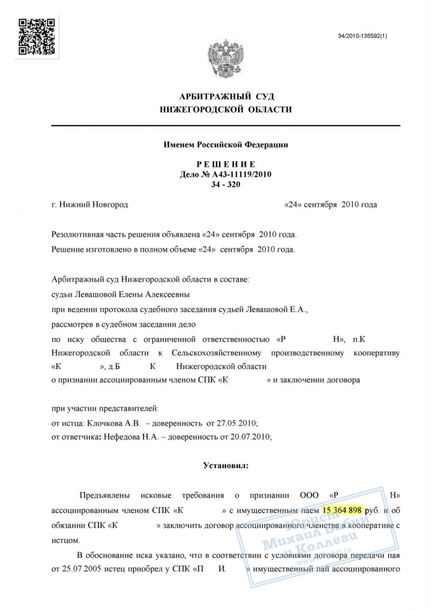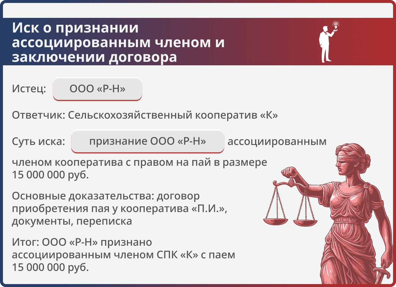 Арбитражный суд признал требования ООО «Р-Н» обоснованными. ООО «Р-Н» стало ассоциированным членом СПК «К» с паем в размере 15 000 000 руб. Кооператив обязан включить новую организацию в реестр пайщиков и выплачивать причитающиеся дивиденды.