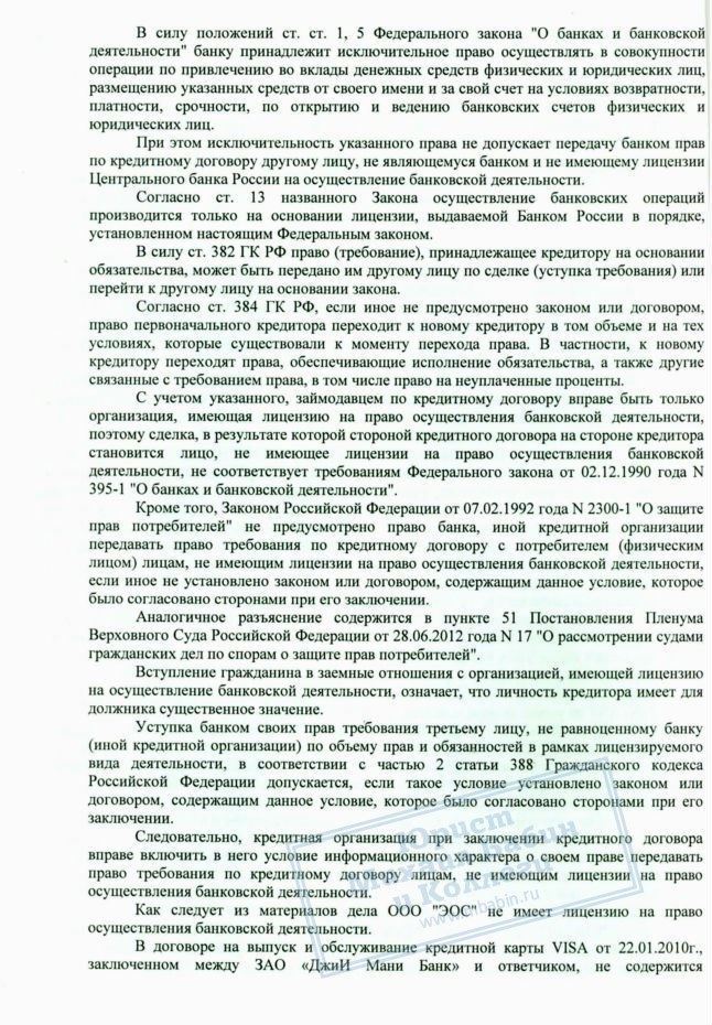 В процессе подробного исследования заключенных между банком и заемщиком документов юрист, защищавший интересы клиента, пришел к выводу, что претензии ООО «ЭОС» к Ш. не имеют под собой правовых оснований: агентство не имеет лицензии на банковскую деятельность, а договор с Ш. не подразумевает возможности передачи прав на взыскание долга 3-ему лицу.