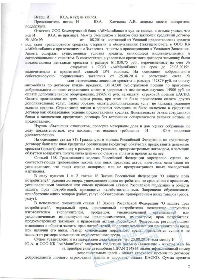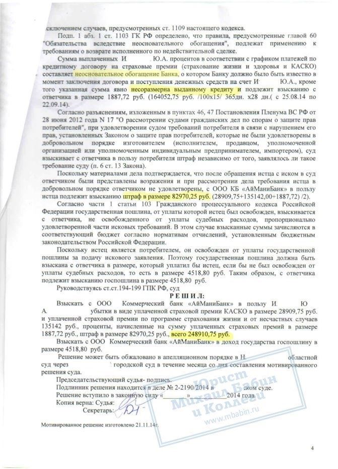 В результате, суд обязал банк вернуть страховку, проценты за неё, а также заплатить штраф. Всего 249 000 руб.