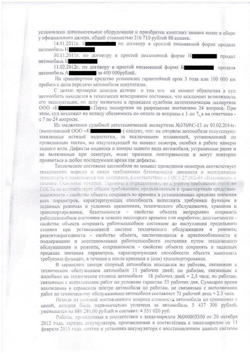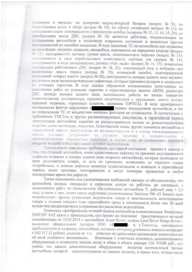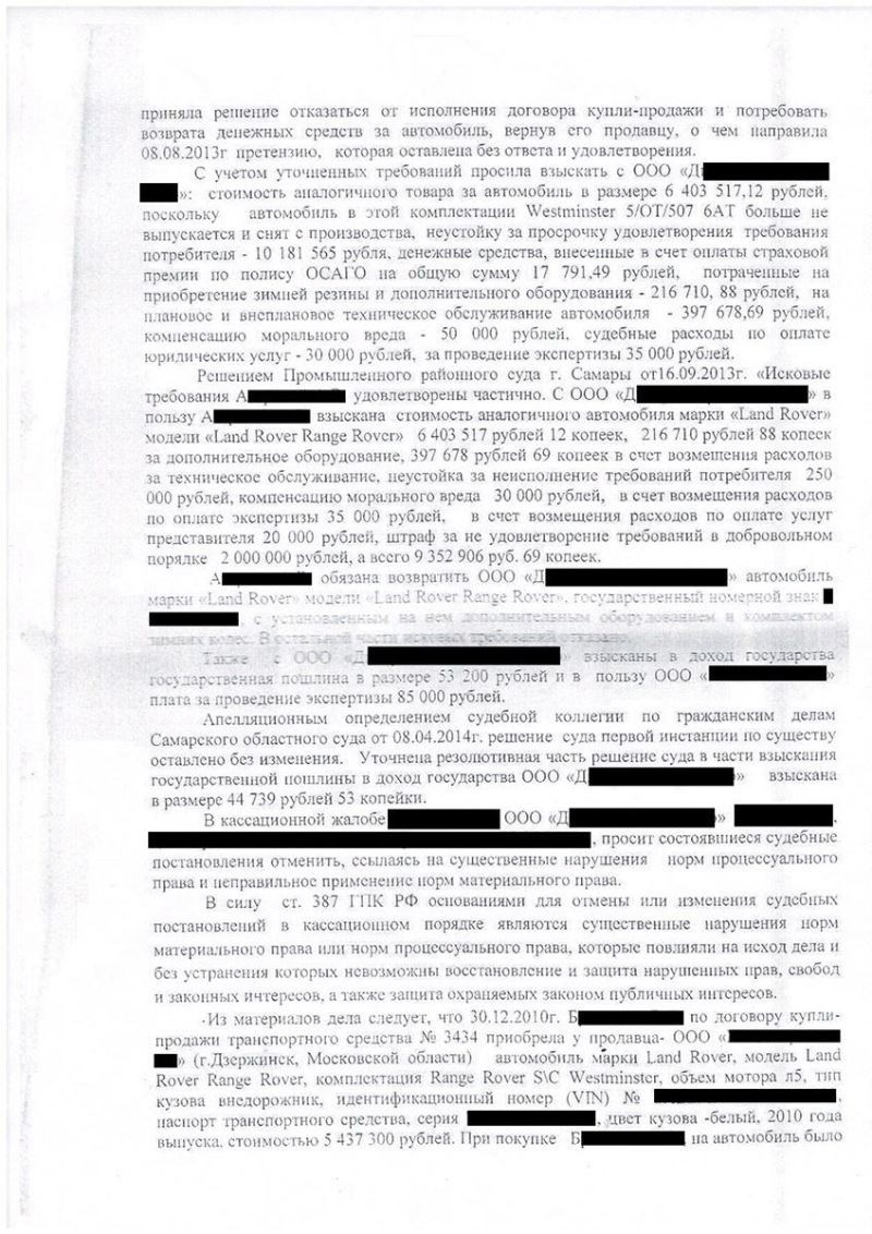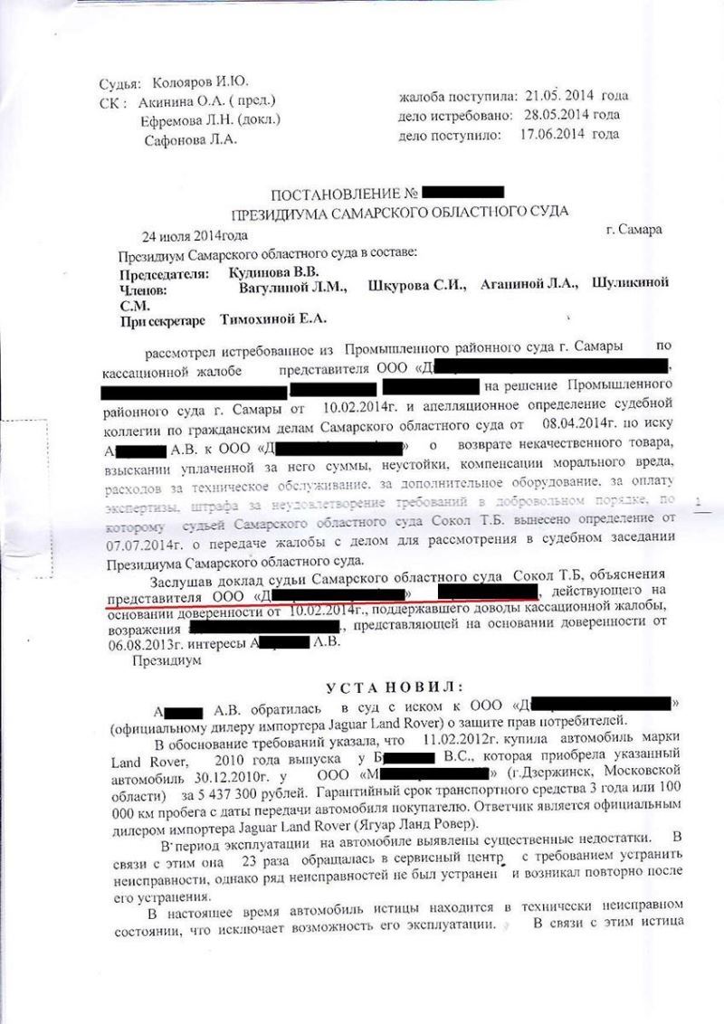 «10» февраля 2014 года Промышленным районным судом г. Самары вынесено решение о взыскании с клиента, являющегося официальным дилером автомобилей Ягуар и Ленд Ровер, 9 352 906 (Девяти миллионов трехсот пятидесяти двух тысяч девятисот шести) рублей 69 копеек в пользу покупателя автомобиля модели Land Rover Range Rover, в связи с заводскими недостатками.