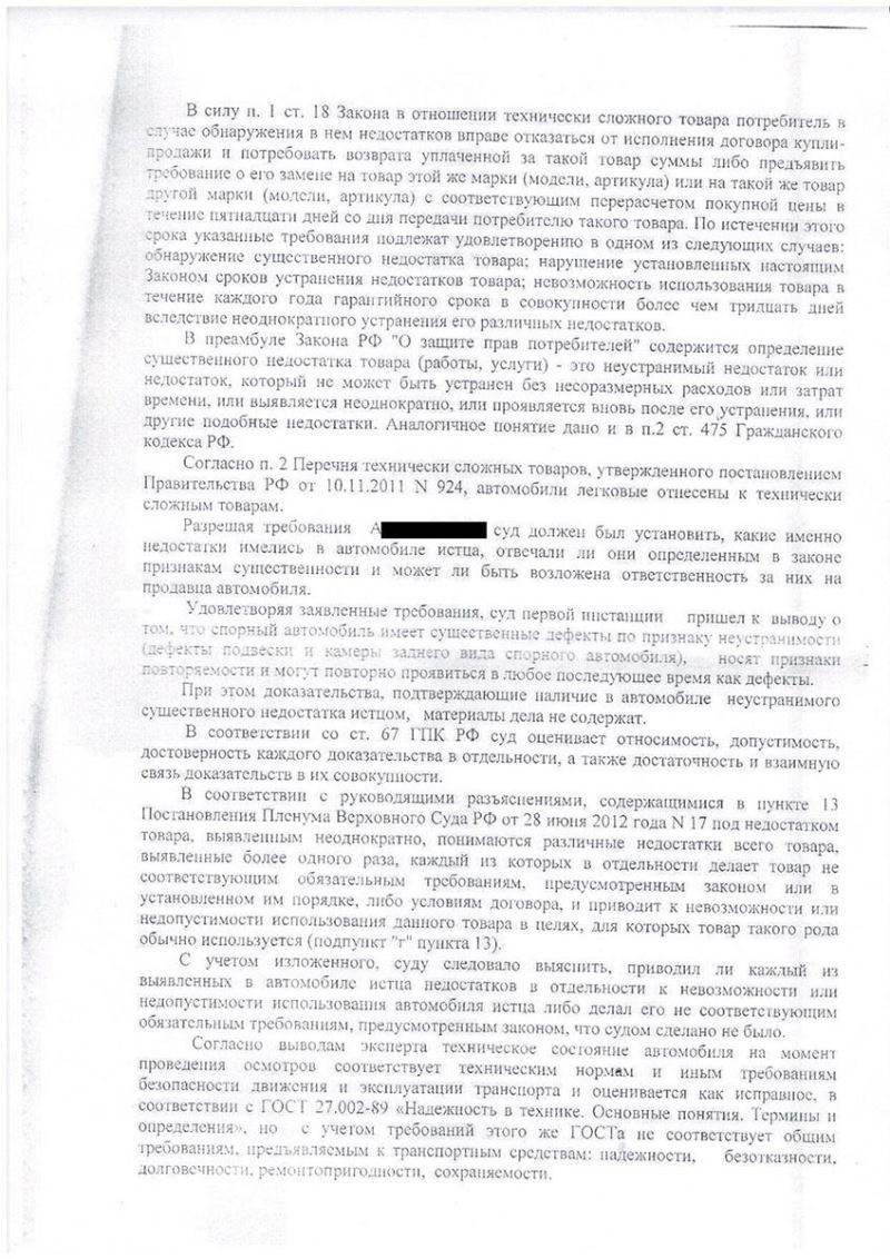 Адвокат вылетел в г. Самару и ознакомился в Промышленном районному суде с материалами дела для составления жалобы. Были найдены основания для отмены решения суда, поскольку при рассмотрении дела допущены как процессуальные нарушения так и по существу спора суду следовало отказать в иске, поскольку не доказано наличие именно заводского брака, а наличие обычных технических неисправностей не является основанием для взыскания полной стоимости нового автомобиля.