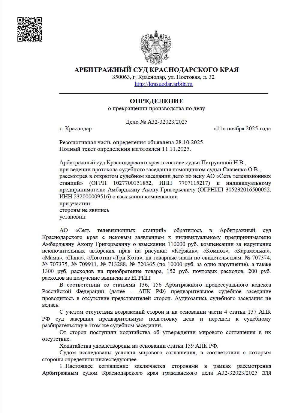 К нашему клиенту, индивидуальному предпринимателю, поступил иск от крупного правообладателя (АО «Сеть телевизионных станций») с требованием взыскать 110 000 рублей компенсации за нарушение авторских прав и товарных знаков, а также дополнительные расходы. Первоначальная сумма претензий была существенной и создавала серьезную финансовую нагрузку.