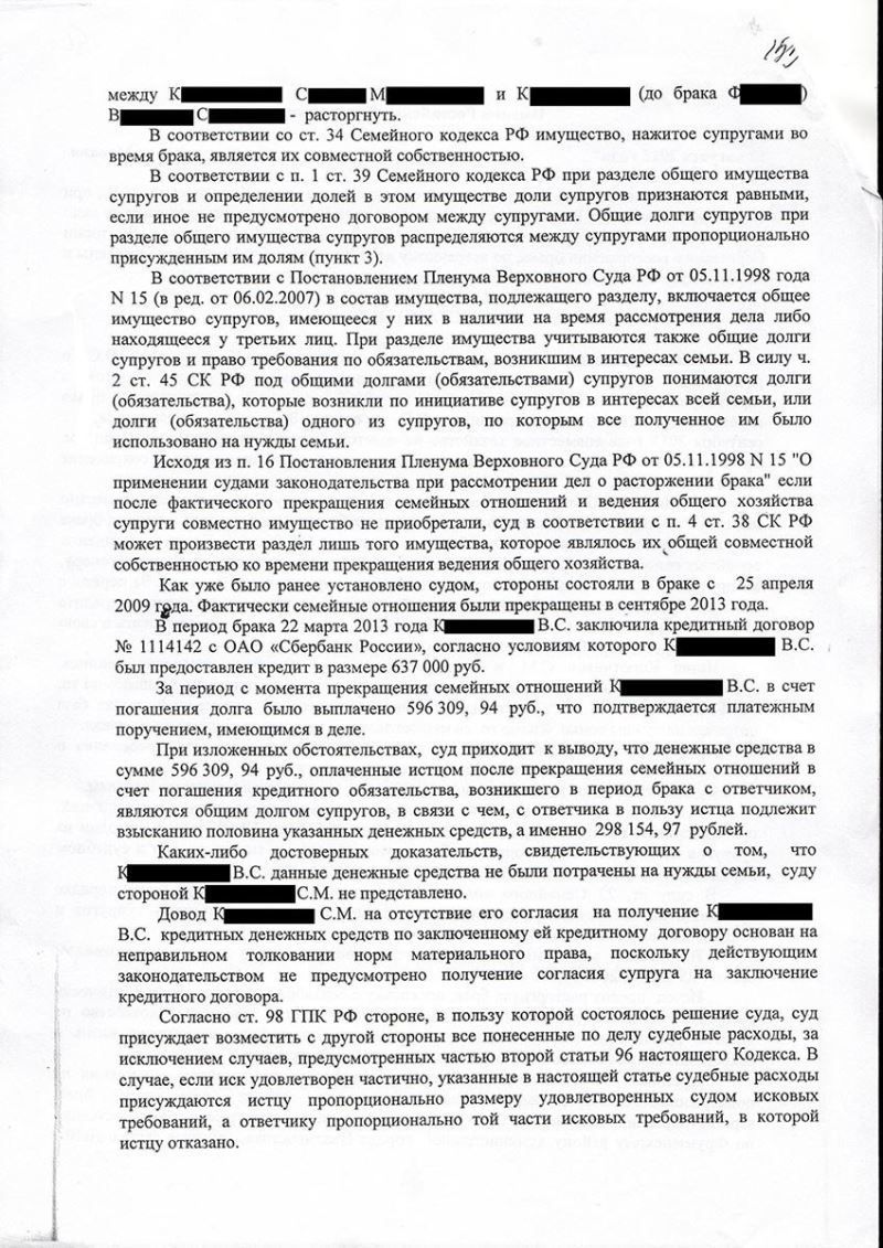 Клиент обратилась к адвокату, поскольку ее супруг подал в суд иск о расторжении брака, однако, у них имеется общий долг перед банком в размере 637 000 руб., который она самостоятельно погасила, а супруг отказывается компенсировать ей половину данной суммы.