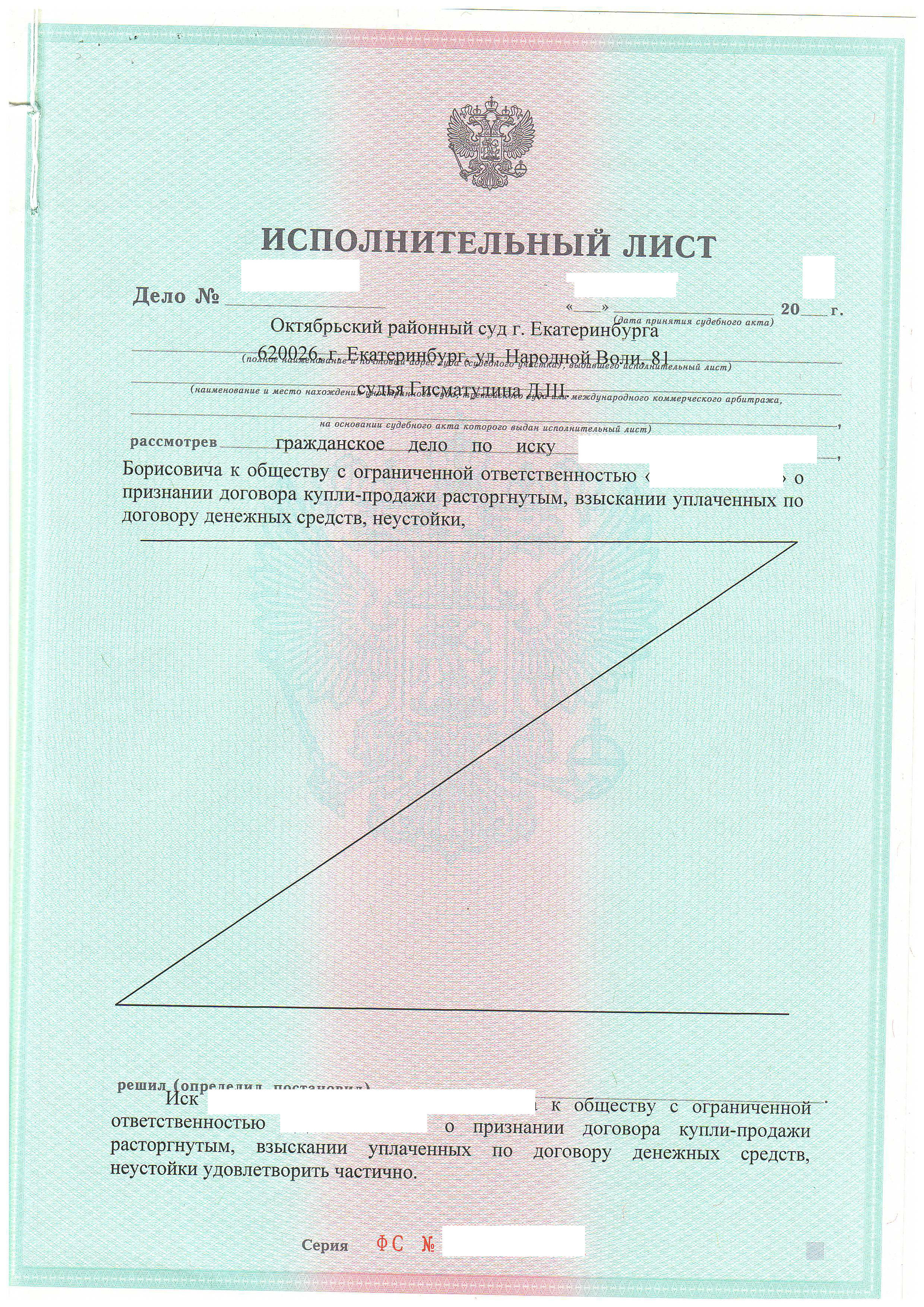 Специалисты нашей компании проанализировали ситуацию, подготовили все необходимые документы и представили интересы нашего доверителя в суде. По результатам рассмотрения дела договор купли-продажи был расторгнут, требования клиента о взыскании сумм, уплаченных по договору купли-продажи, и неустойки были удовлетворены частично.