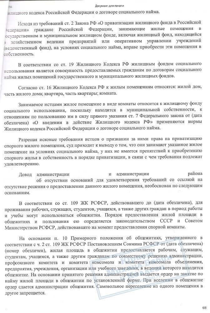 Гражданка К. попыталась оформить право на комнату в общежитии после смерти своего мужа, но ей было отказано. Только благодаря грамотным усилиям юриста за ней и ее сыном было признано право собственности на данное помещение.