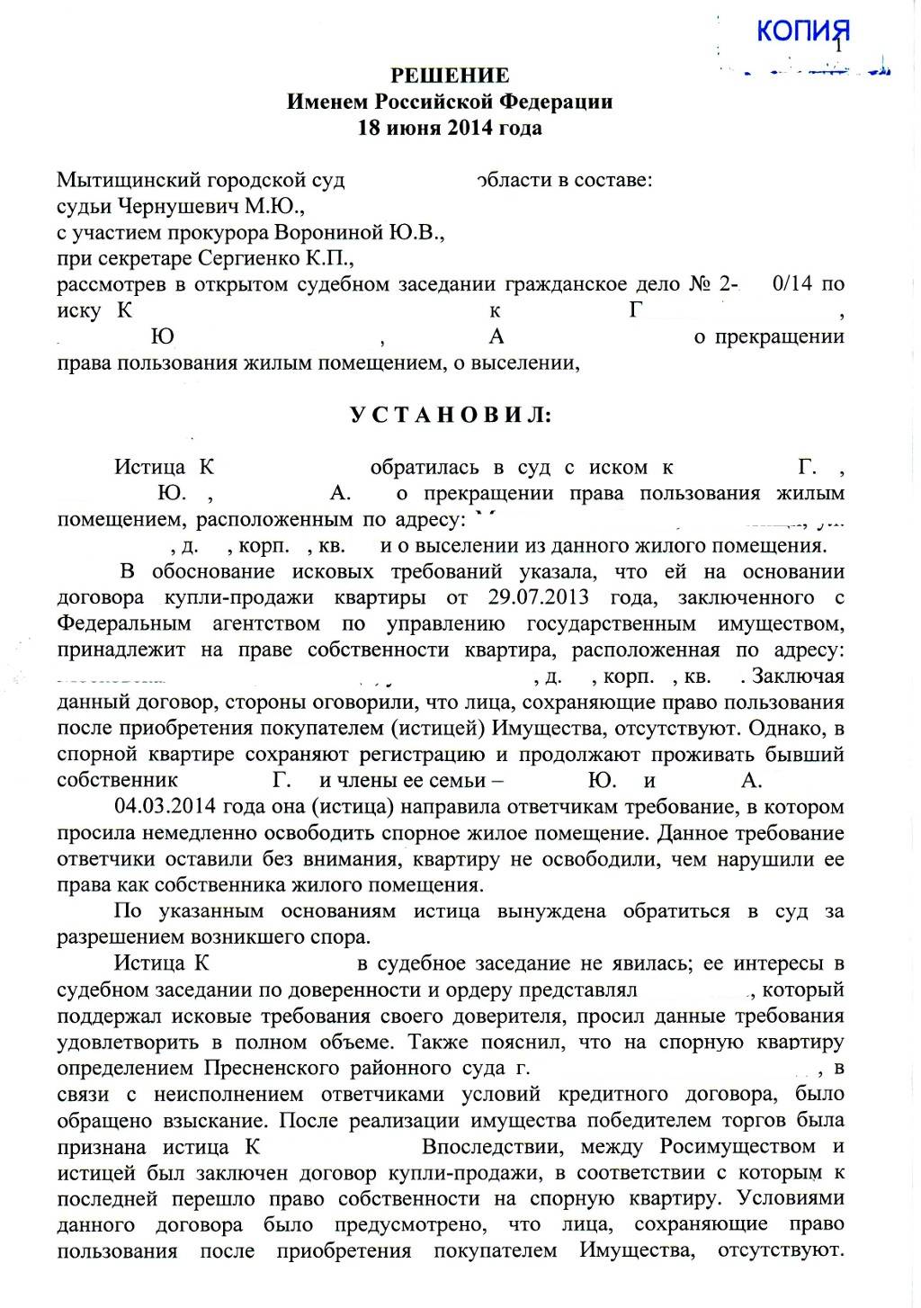Перед заключением сделки купли-продажи было оговорено, что лица, проживающие на момент подписания договора, после перехода права собственности на квартиру истице будут отсутствовать. Однако ответчик и члены его семьи отказались добровольно покидать квартиру. В связи с этим истица вынуждена была обратиться в суд.