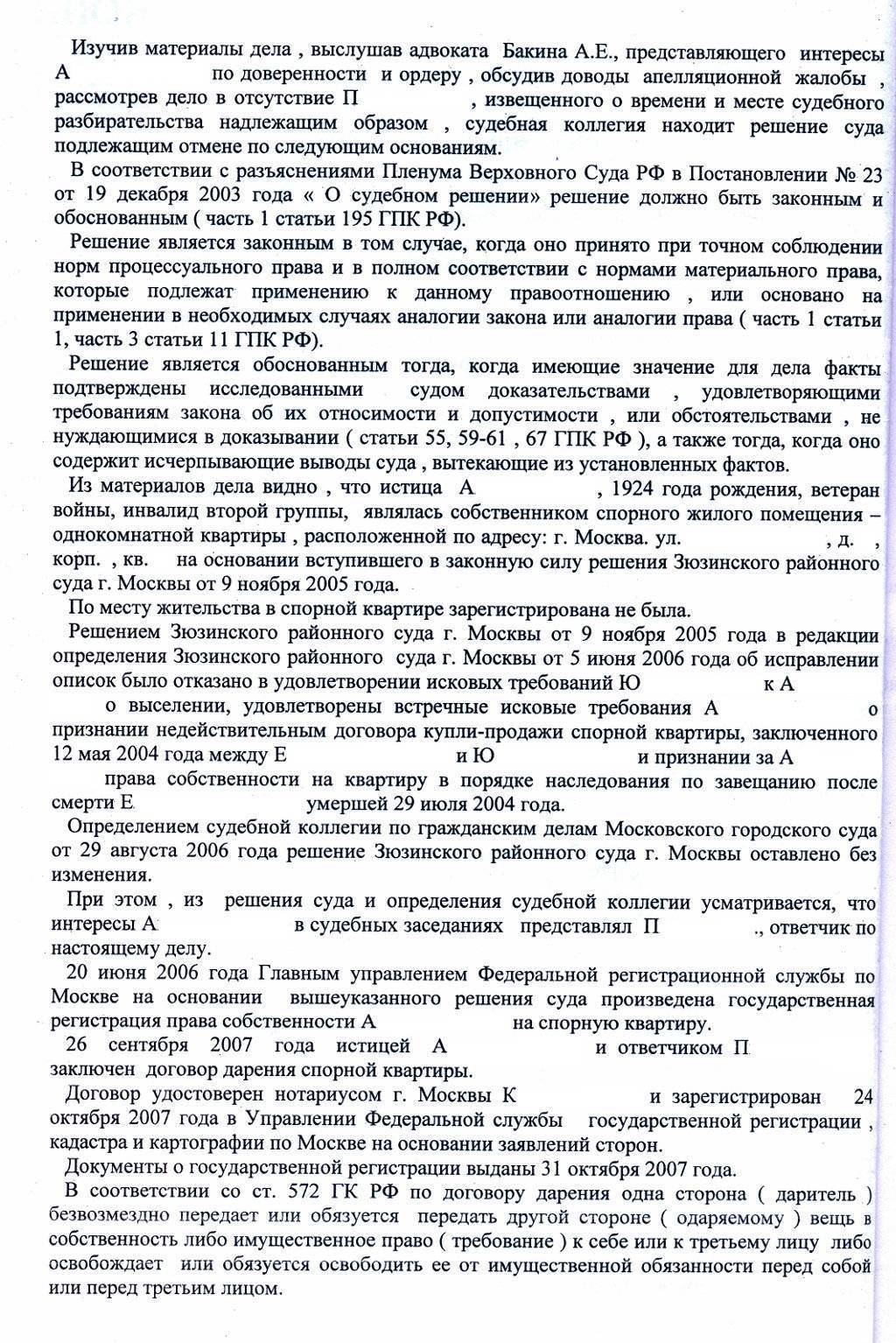 Судебная коллегия, учитывая изложенные факты, пришла к выводу об удовлетворении исковых требований, постановив отменить решение районного суда, признать недействительной сделку дарения, вернуть однокомнатную квартиру в собственность истицы.